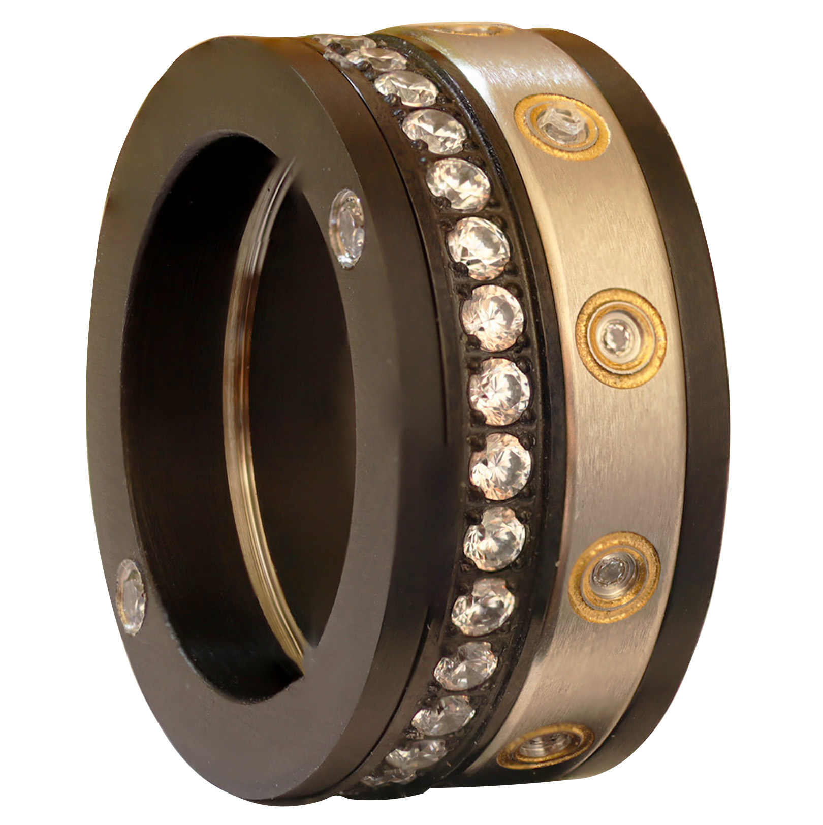 Dieser Ring besteht aus einem 10 mm breiten schwarzen Basisring, zwei Füllringen, einem in Silber mit Zirkoniasteinen und einem in Schwarz, umgeben von Zirkoniasteinen. Zu diesem Ring haben wir die beiden Seiten der gleichen Farbe, aber es wäre auch möglich, mit jeder Seite von einer Farbe, um eine noch spektakulärere Ring zu schaffen.