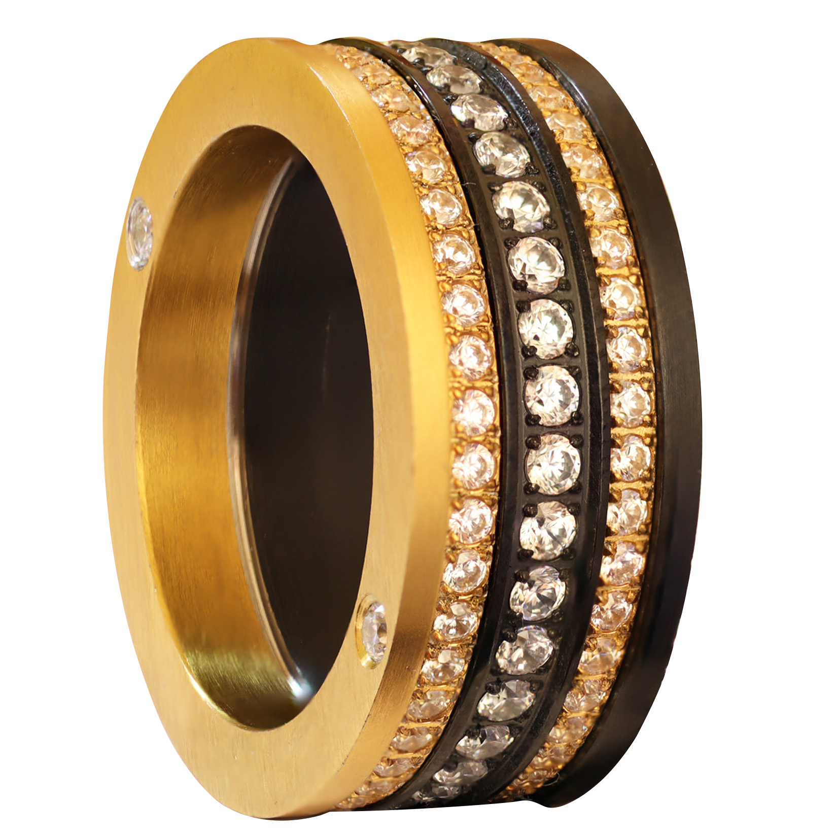 Cette bague est composée d’un anneau de base noir de 10 mm, de deux anneaux de remplissage en or avec des pierres en zircone et d’un large anneau noir avec des pierres en zircone. Nous avons également mis un chapeau de chaque couleur sur cette bague pour créer une bague encore plus spectaculaire.