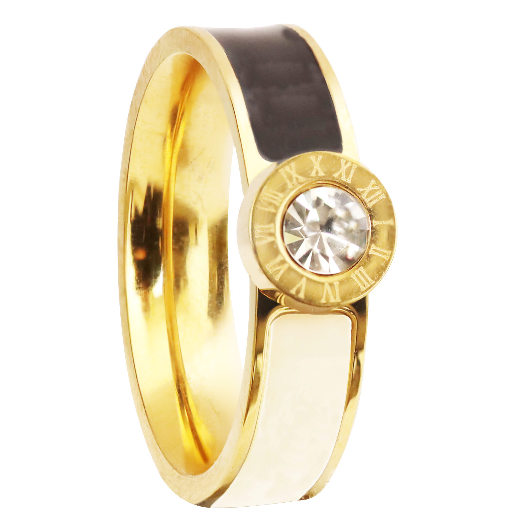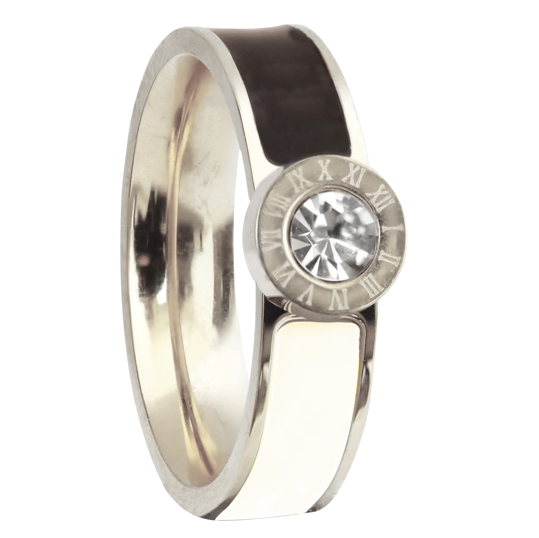 This Ring is Halg White Half Black And has a Round Shaped Cubic Zirconia Stone Surrounded With Roman Numbers