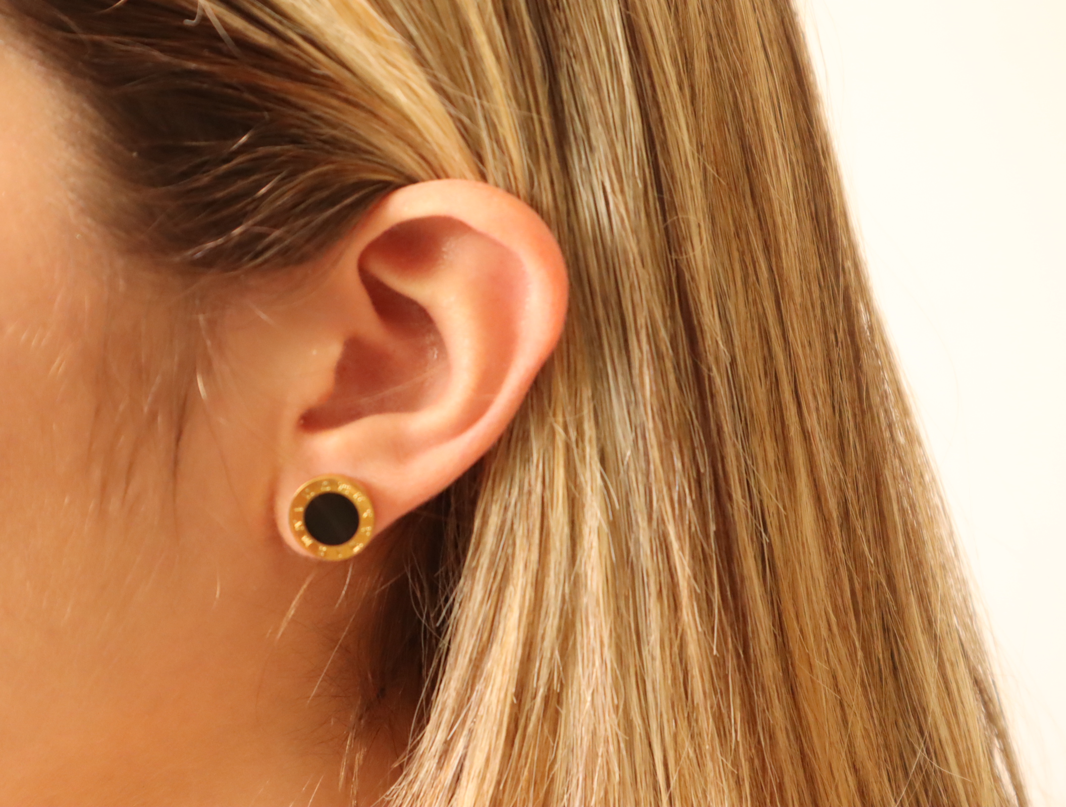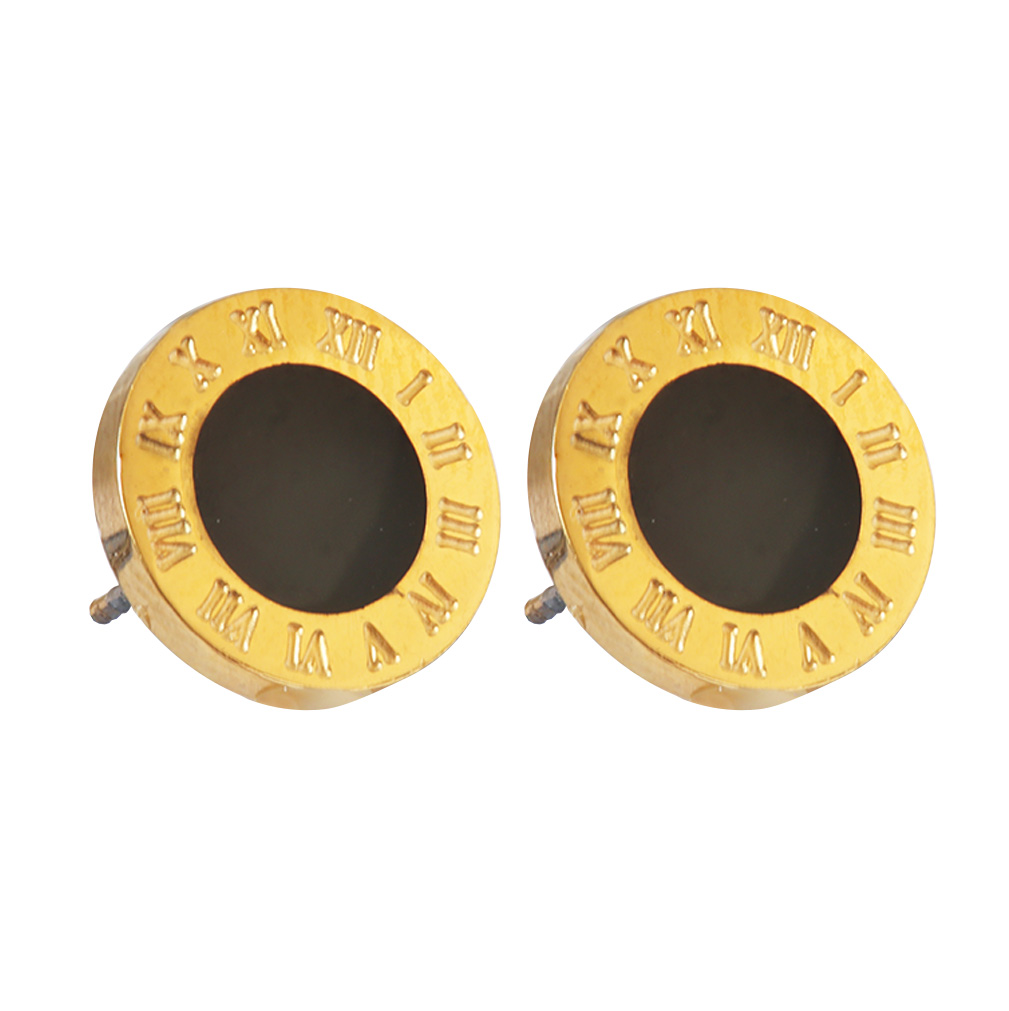 Gold Earrings Round Shaped With Roman Letters and Black Circle