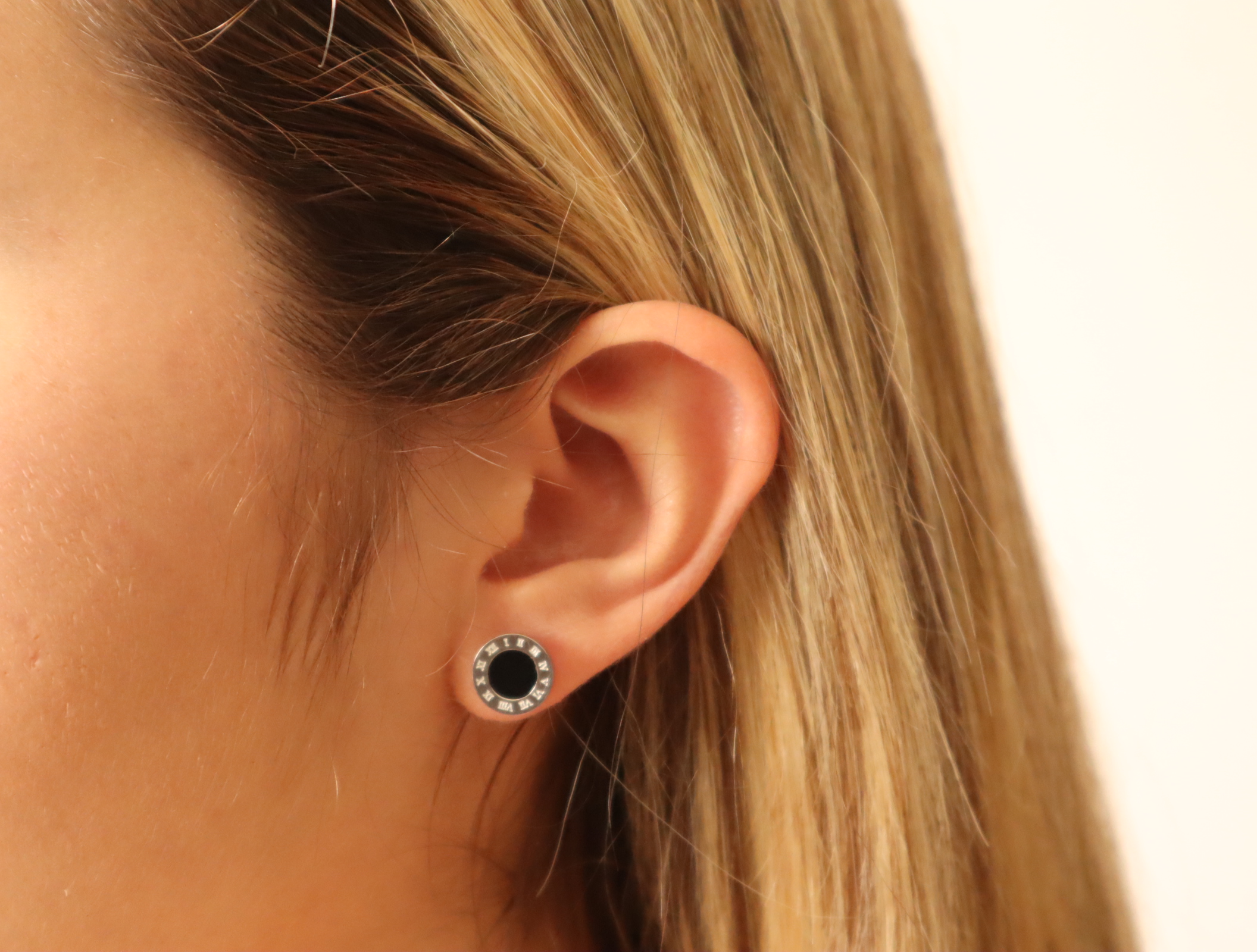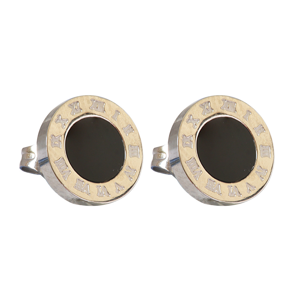 Silver Earrings Round Shaped With Roman Letters and Black Circle