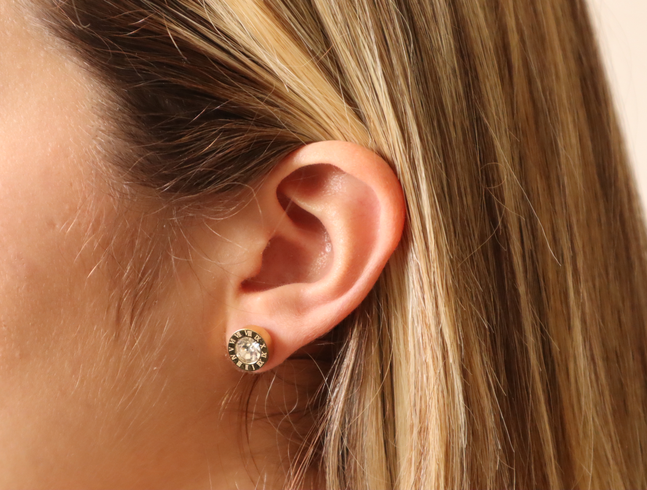 Silver Earrings Round Shaped With Roman Letters and Zirconia Stone
