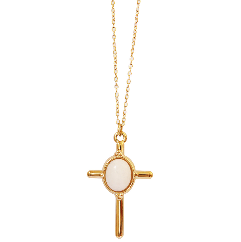 Gold Color Necklace With a Big size Cross and a White Agate Stone