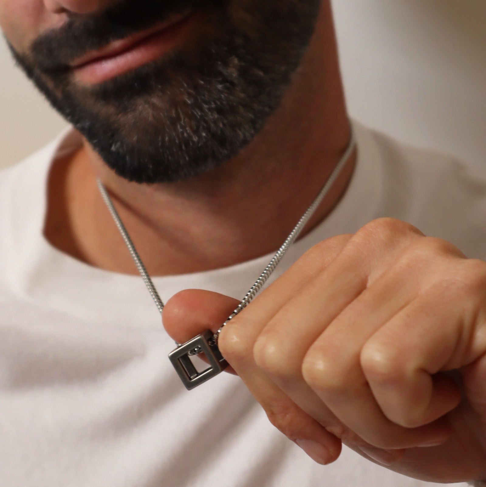 Silver Color Necklace With a 3D Square Pendant in Ancient Silver Color